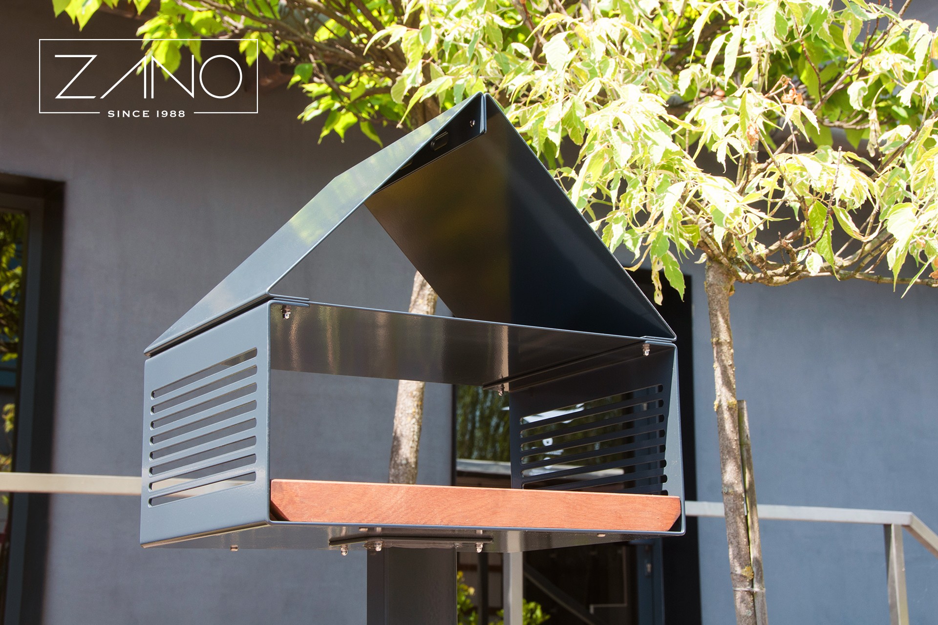 Struttura in acciaio con elementi in legno. A scelta, legno di conifera europeo o esotico. Acciaio inox o acciaio al carbonio verniciato in qualsiasi colore RAL. La mangiatoia ha due varianti: su palo e da appendere all'albero.