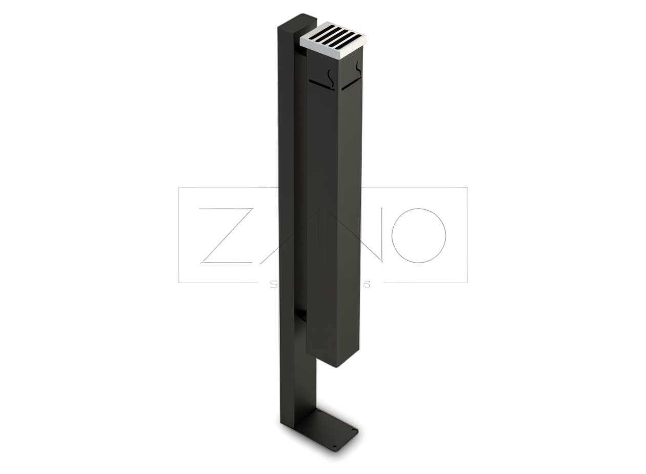 Il posacenere 09.013 è un modello moderno appartenente alla serie di prodotti moderni. Presenta un caratteristico contenitore per rifiuti di forma allungata fissato al palo principale. Il posacenere può essere realizzato in acciaio nero o in un più resistente acciaio inox. L'intera struttura viene montata a terra mediante ancoraggio o fondazione in calcestruzzo. Il posacenere 09.013 è progettato per essere utilizzato sia all'esterno che all'interno di aree riservate ai fumatori.