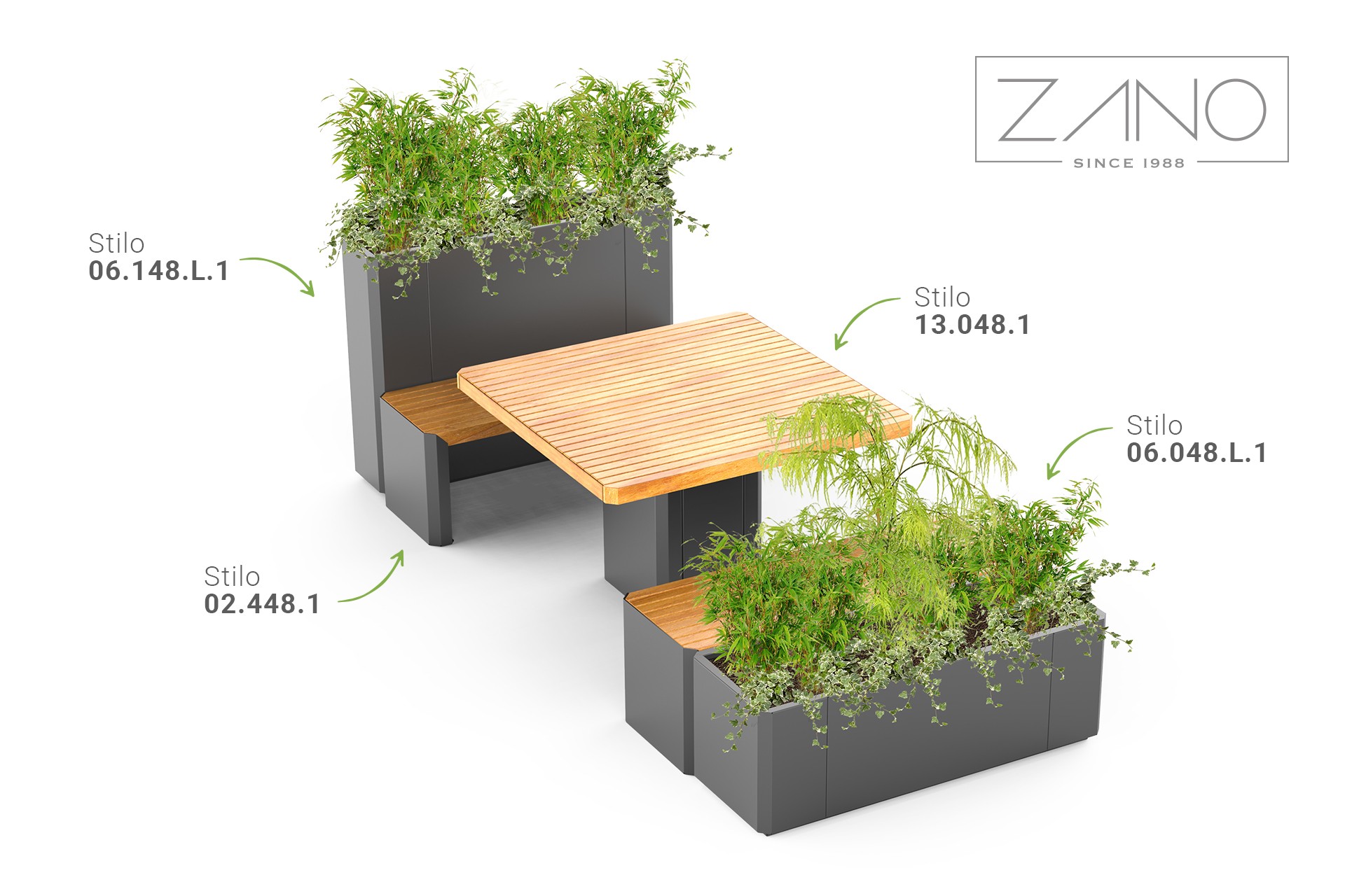 Stilo 13.048 è un grande tavolo urbano compatibile con le panche della gamma Stilo. È possibile combinare i prodotti per creare spazi da pranzo.