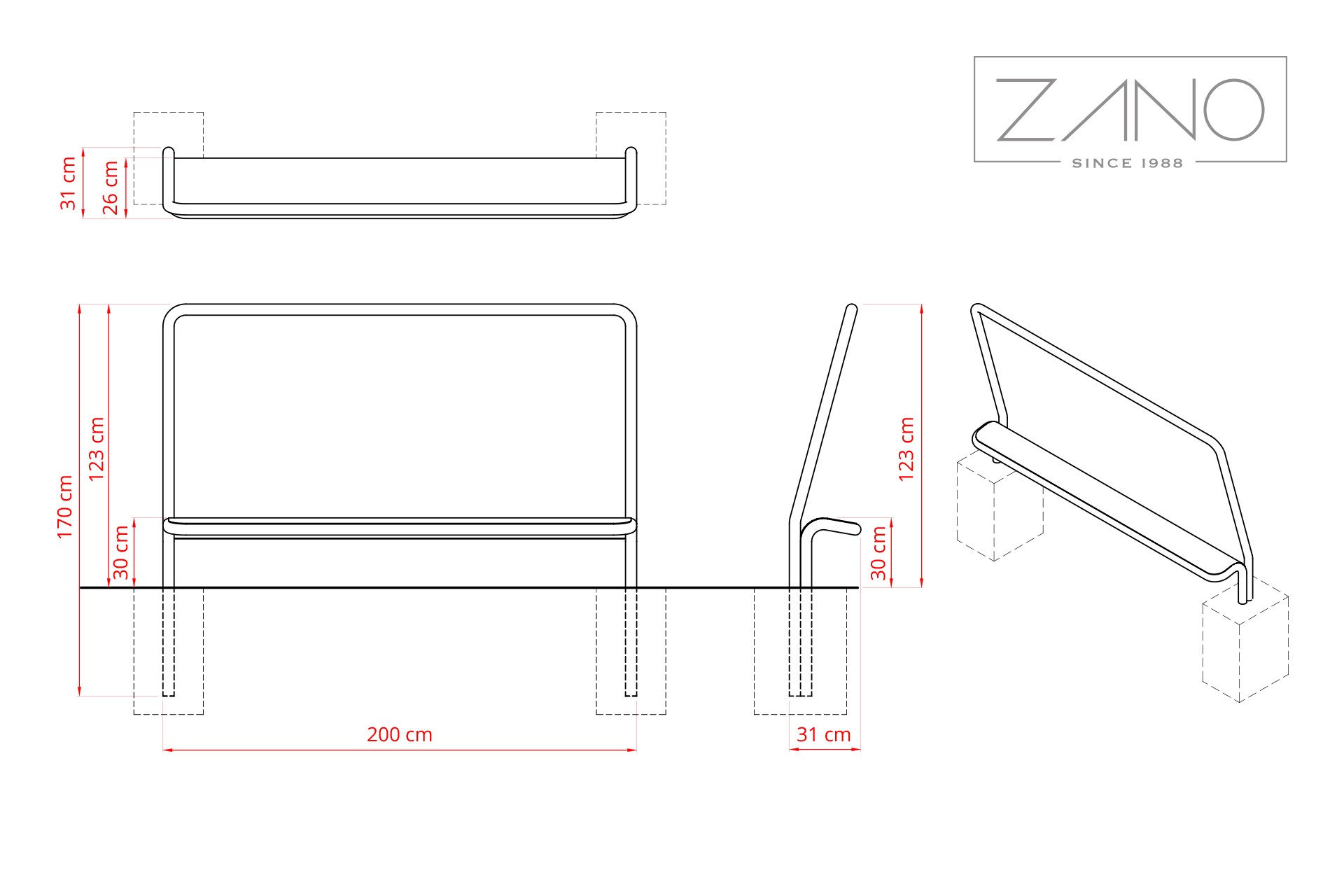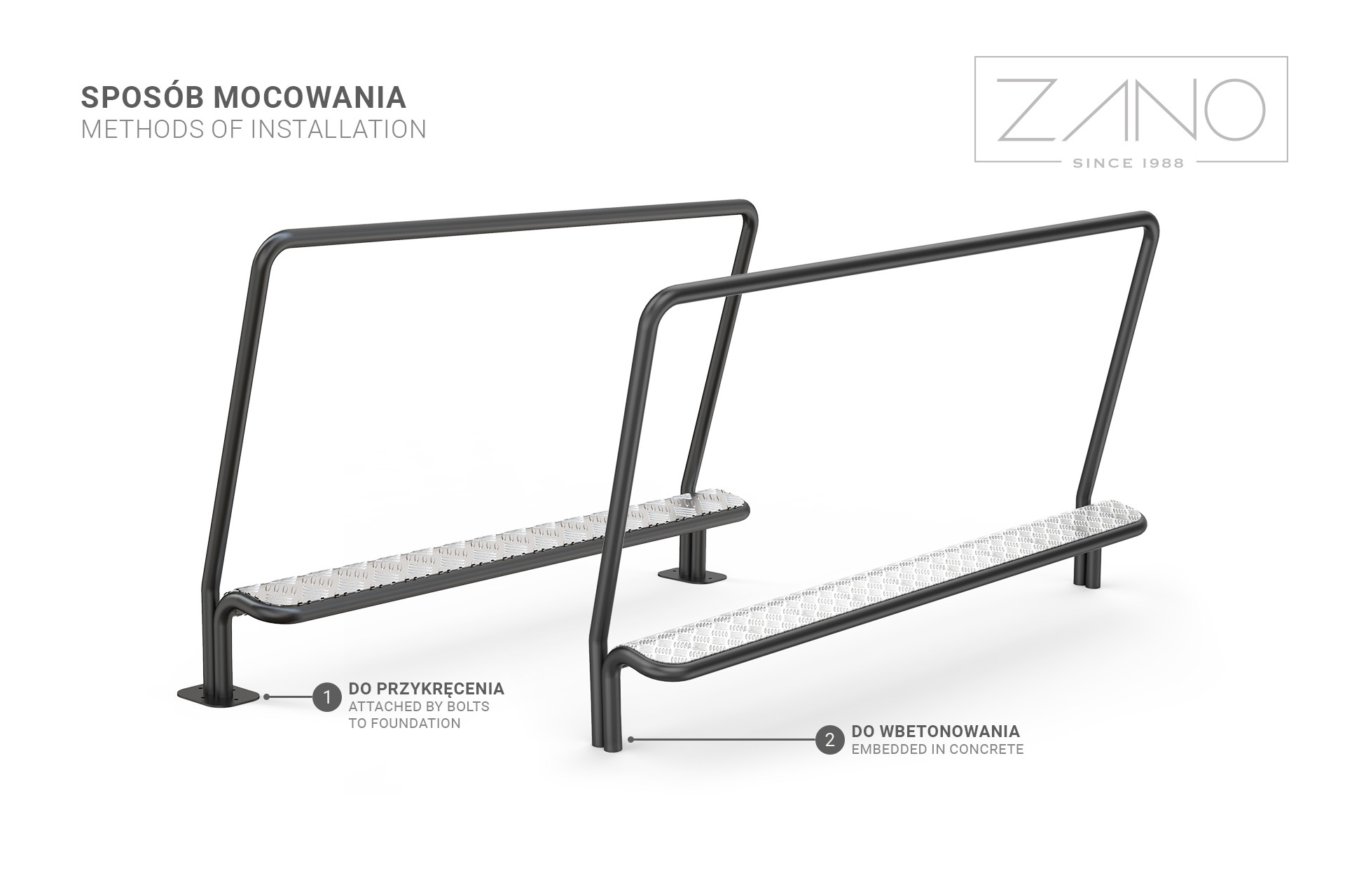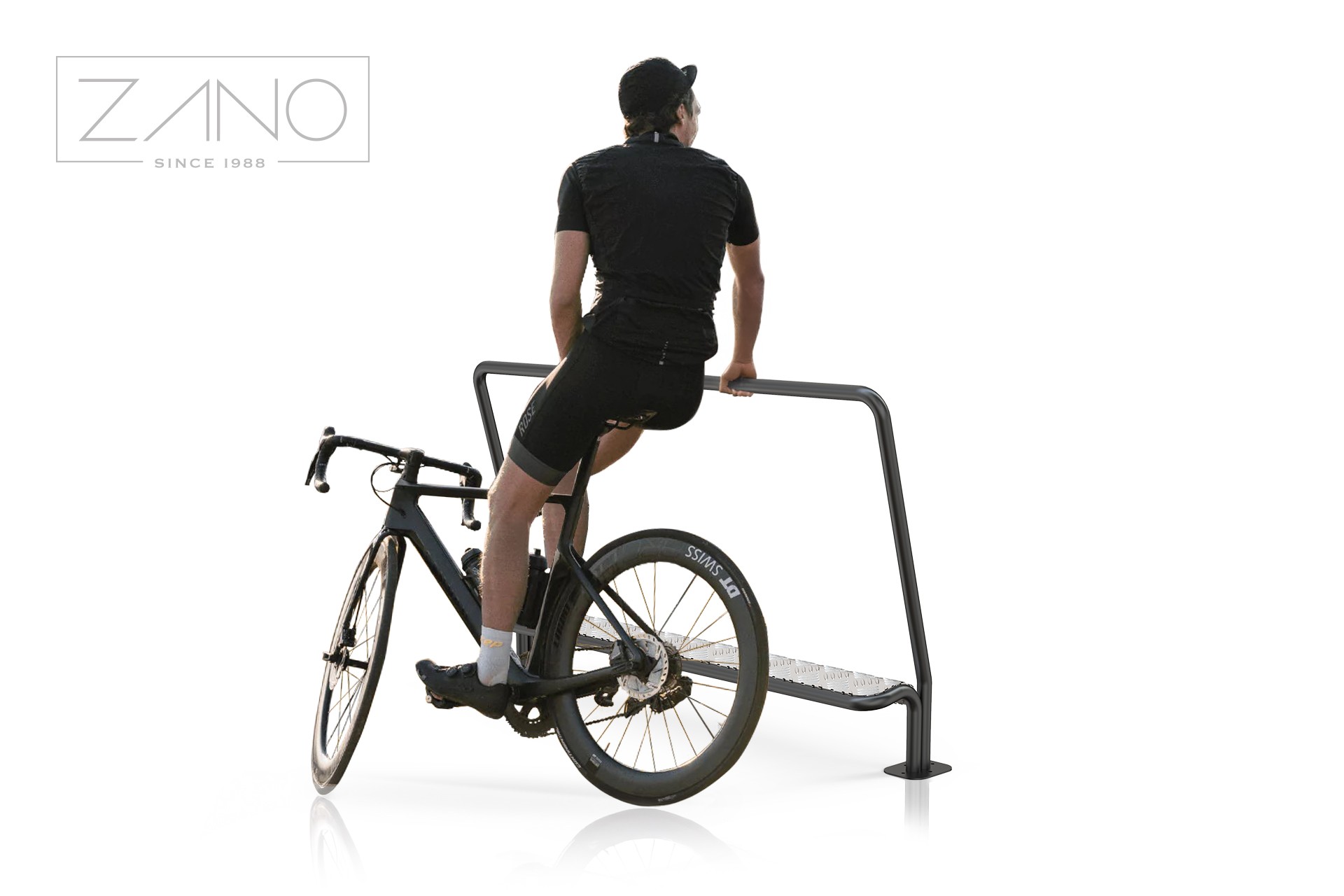 Il supporto per ciclisti è realizzato in tubi e si compone di due parti. Su quello più alto ci si può aggrappare con la mano e su quello più basso si può appoggiare la gamba. Il design semplice permette di integrarlo in qualsiasi spazio urbano. Il supporto è in acciaio inox o in acciaio zincato. Installazione con fondazione in calcestruzzo o tasselli.