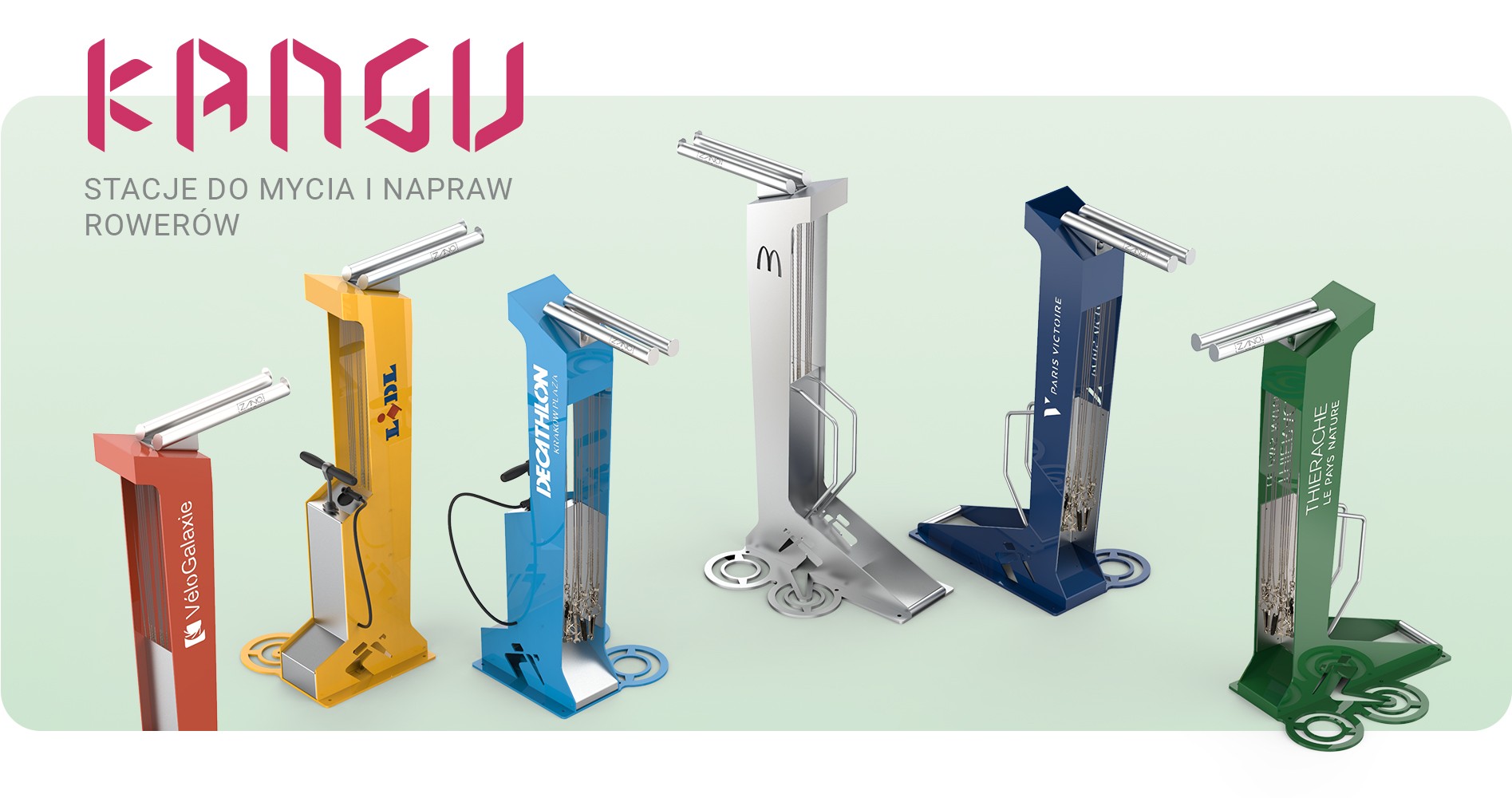 Una presentazione collettiva di tutte le stazioni per biciclette e i cavalletti della serie KANGU.